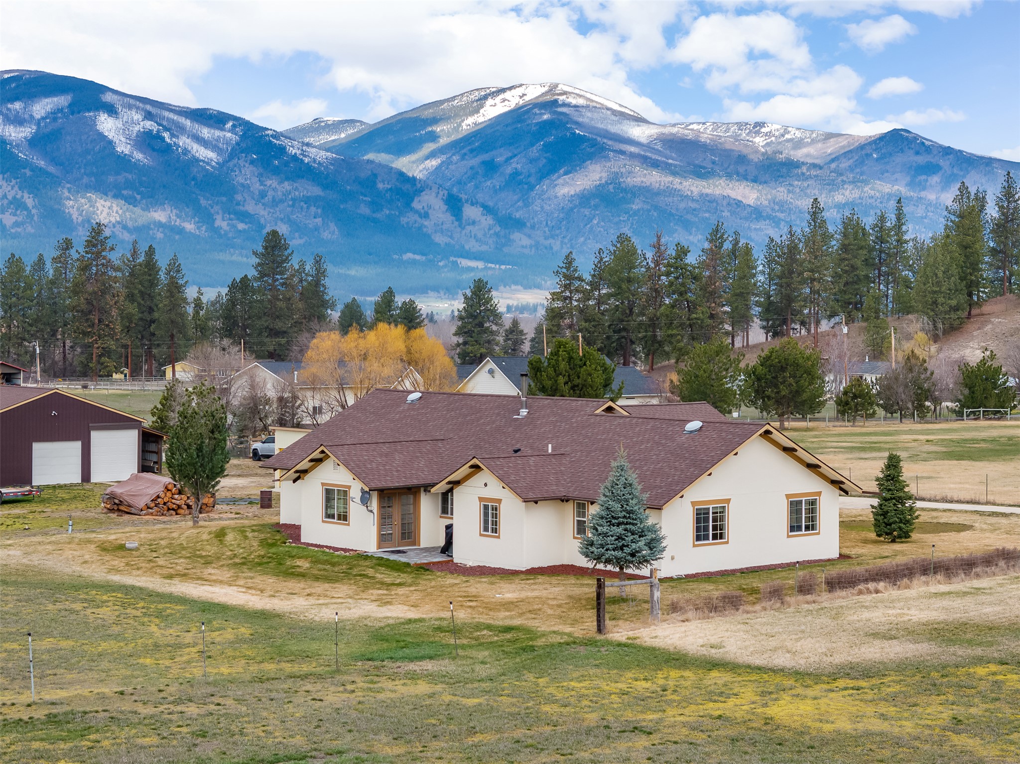 A truly rare offering in the heart of the Bitterroot Valley—this beautifully maintained multi residence property spans 6 private, usable acres perfectly positioned between the stunning Bitterroot and Sapphire mountain ranges. Tucked away on a quiet country dead-end road, yet offering easy access to Stevensville and Missoula, this property delivers the ideal balance of seclusion and convenience. Featuring five total living units, including two thoughtfully designed duplexes and a spacious single-level home, this versatile property is perfectly suited for multi-generational living, rental income, or a private retreat. The single-level main residence offers approximately 1,892 sq ft of comfortable living space with 3 bedrooms and 1 3/4 bathrooms, built with quality 2x6 construction. Enjoy Montana’s seasons year-round from the bright and inviting sunroom. An attached, fully finished end-to-end 4-car garage provides exceptional storage and functionality. Equestrian and hobby farm enthusiasts will appreciate the well-equipped setup, including a 48x36 barn with a 12x20 overhang. With a bit of finish work, the pasture can be fully enclosed. An additional multi-function building featuring a storage unit, wood room, and run-in shelter—both with electricity. The two duplexes offer excellent income potential or flexible living arrangements: • First Duplex: One 3 bed/2 bath unit and one 2 bed/1 bath unit, each with a 1-car attached garage • Second Duplex: Two 2 bed/1 bath units, both with 1-car attached garages Each residence is independently serviced by its own well and septic system with underground sprinkler systems around the buildings. Whether you’re seeking a unique investment opportunity, a multi-family compound, or a peaceful rural lifestyle with room to grow, this exceptional property truly offers it all.